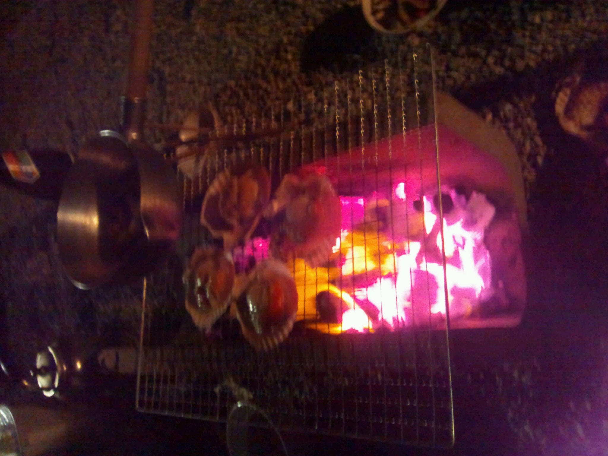 さて釣ったそのイワナ、夜に塩焼きと骨酒でいただきました。屋外でバーベキューみたいにです。北海道のホタテも一緒に食べました。